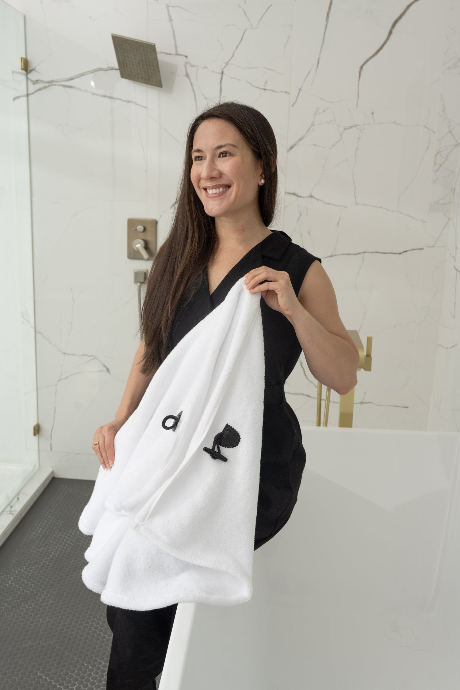Ever since I was a little girl, I'd get out of the bath or shower with wet hair, which immediately soaked through my pajama top. I'd take a towel and drape it over my shoulders (like so many of us do!) and that worked for a little while... until I would be using my hands and my towel would slip off my shoulders. You might know the feeling! So annoying. I thought, "This needs to have a clasp," and the Dry Cape™ was born.